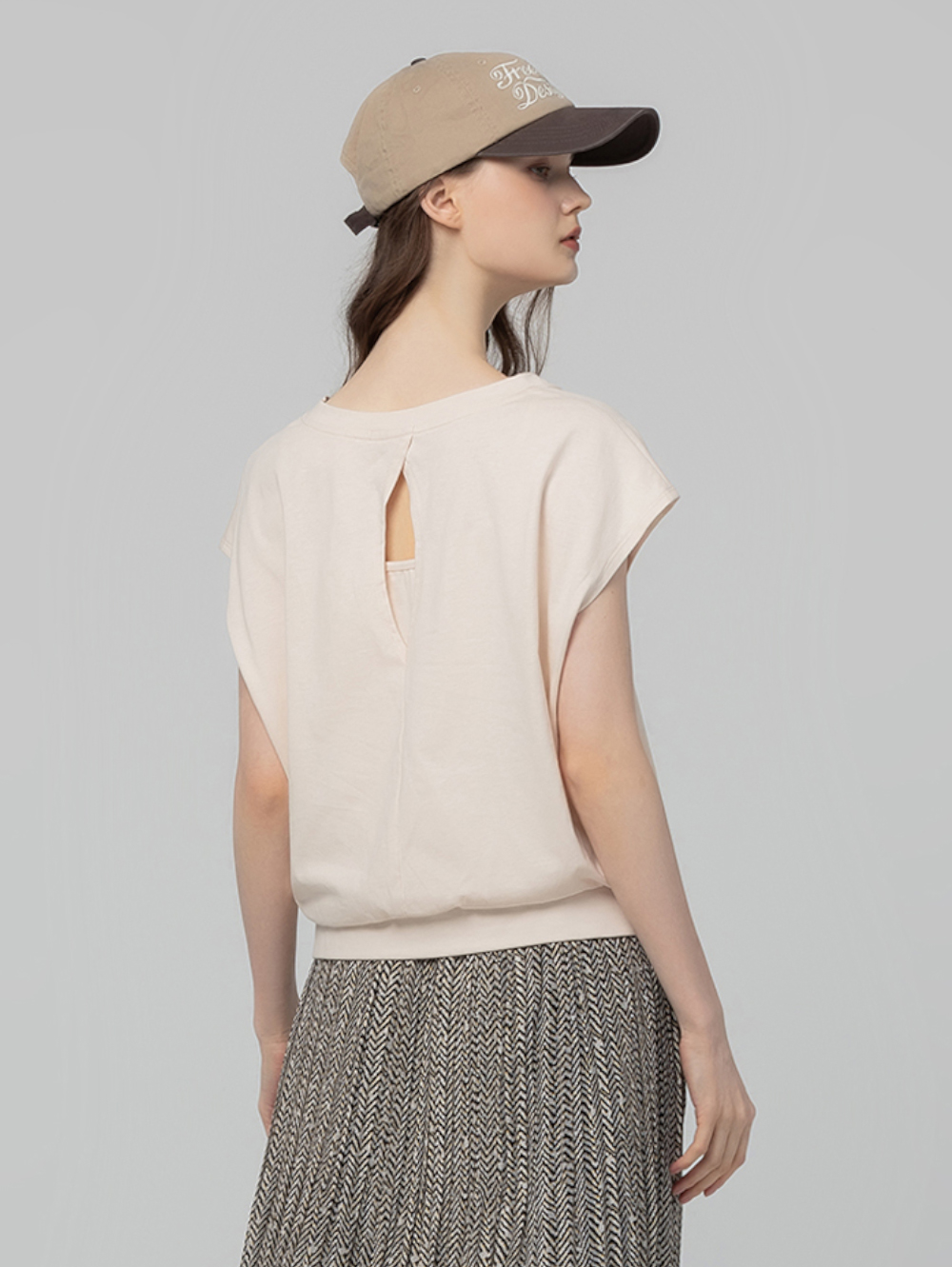 假兩件設計,背心與短袖在內側下擺車固定。正面文字錯位排列、背後小挖空,富有趣味性,穿起來輕鬆感十足。
