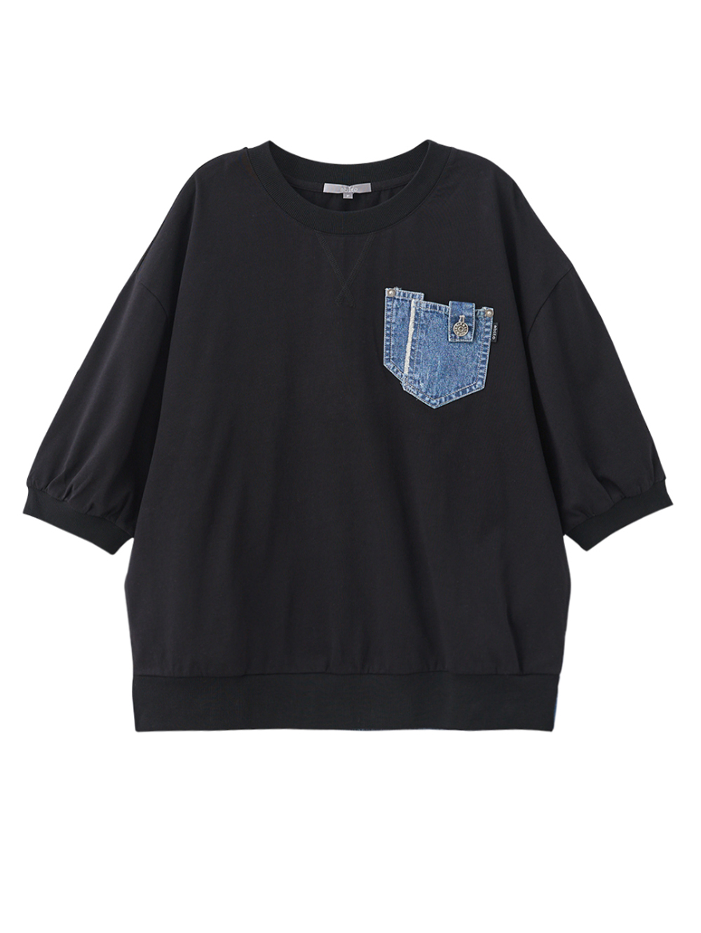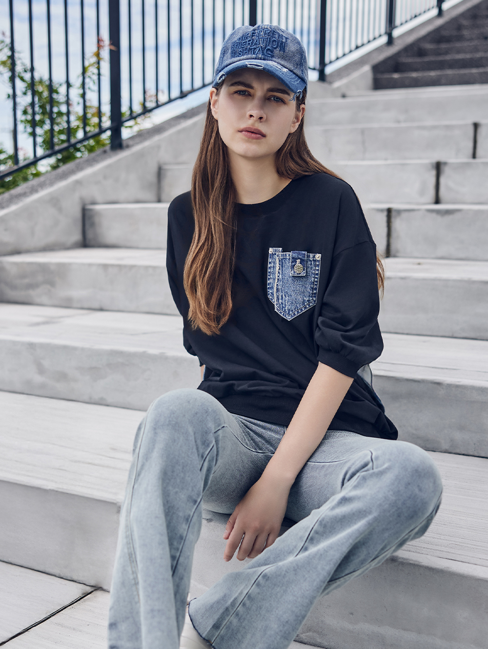 *上衣剪裁舒適寬鬆 *拼接丹寧口袋設計 *圓領羅紋加強領口彈性與耐用 *布料舒適棉質上衣