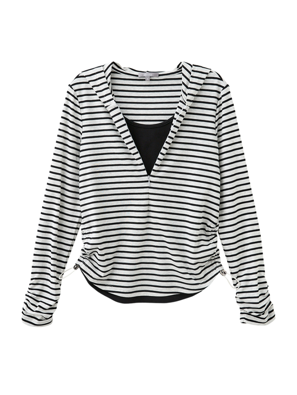 *側邊抽繩收腰設計,顯腰身 *假兩件造型呈現多呈次穿搭 *柔軟棉質面料彈力佳 *胸前影形拉練連帽設計