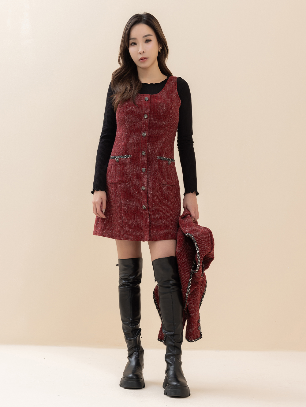 *下擺微A字版型修飾腿型 *金釦排釦設計,時髦高雅 *羊毛成分面料,保暖不厚重 *適合約會、正式場合皆宜