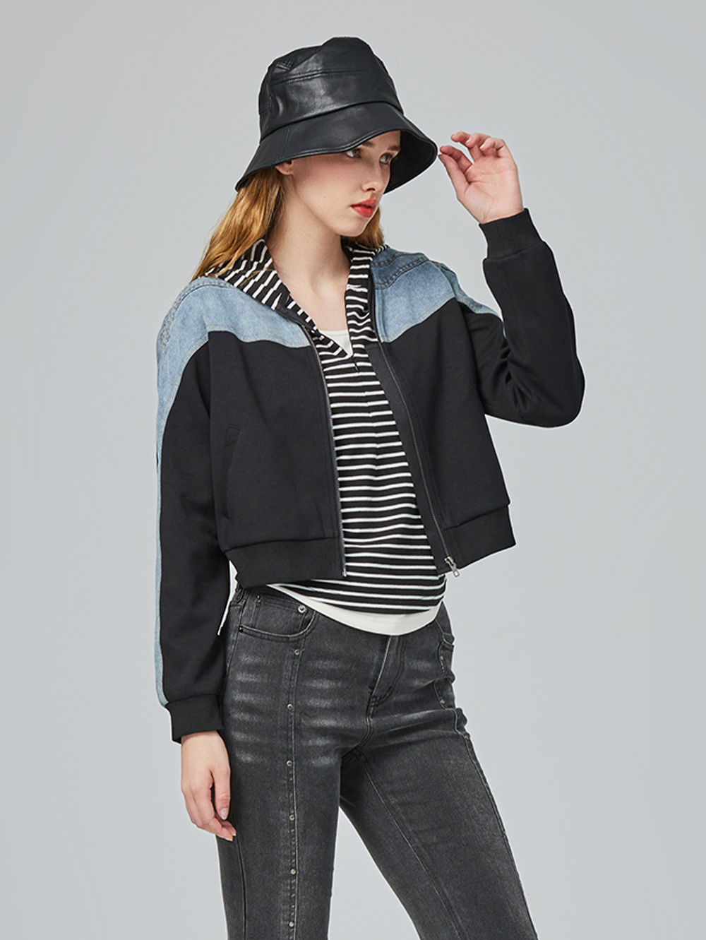*牛仔布料拼接造型 *拉鍊連接領圍特殊設計 *短版剪裁修身比例 *羅紋立領加強彈性與耐用