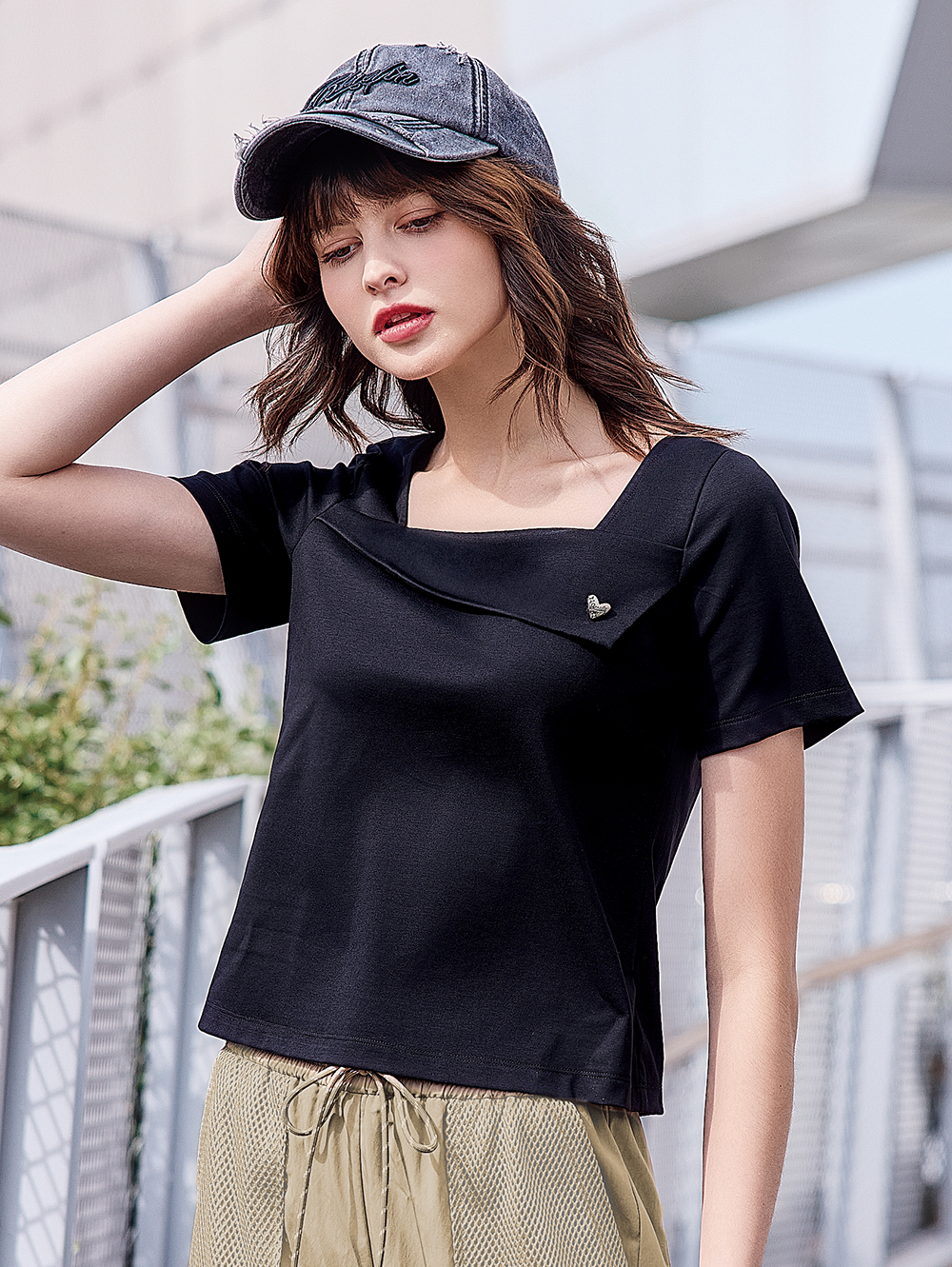 *質感方領剪裁,修飾鎖骨線條 *精緻金屬愛心裝飾細節 *柔軟親膚彈性棉質面料 *優雅氣質日常百搭款