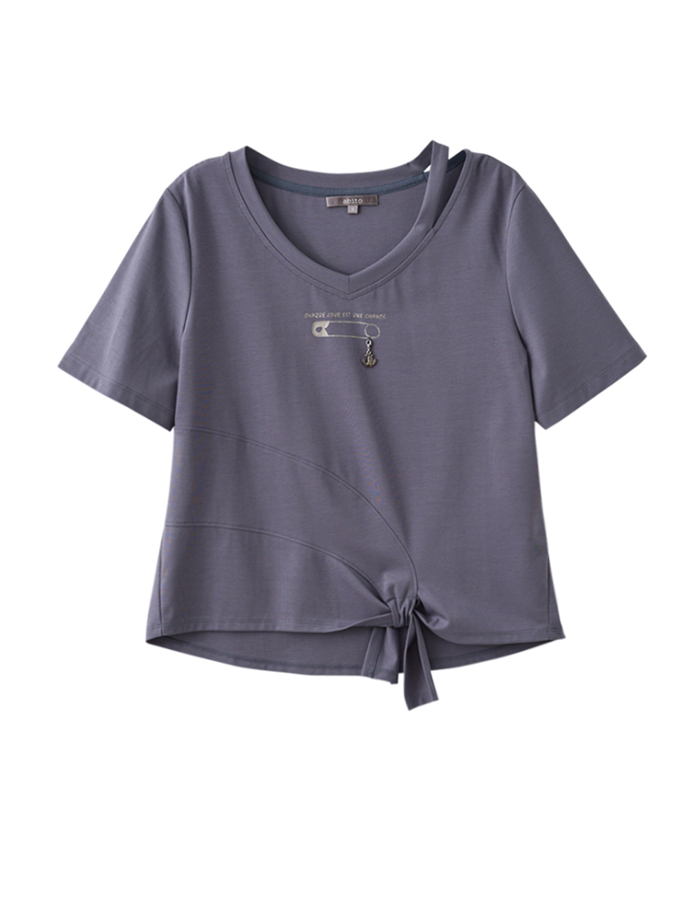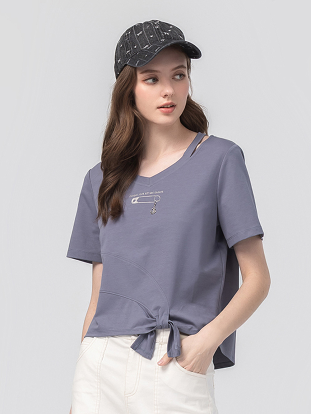 *獨特扭結設計版型剪裁 *V領簍空剪裁,修飾頸部線條 *印花別針造型,加上精緻金屬墜飾細節