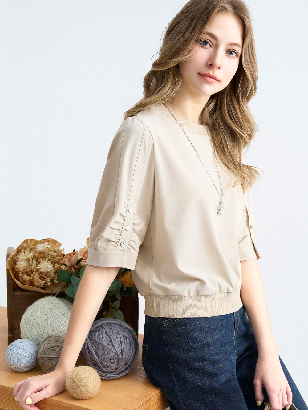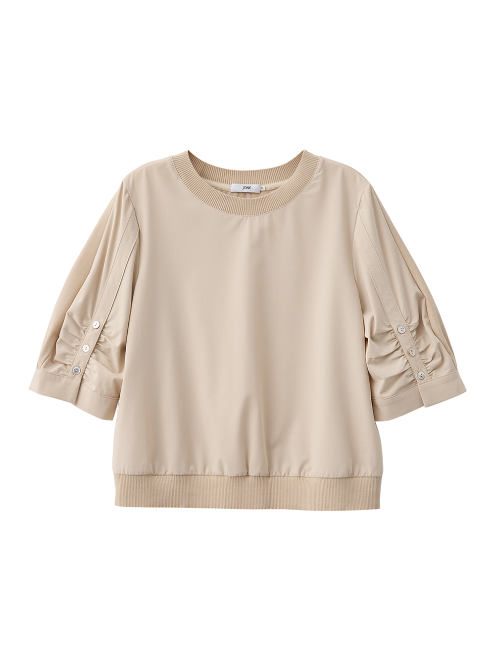 前平織後T恤拼接上衣, 質感到位機能性不減, 造型抽皺袖讓基本單品更有特色, 可與同系列裙裝作成套搭配。