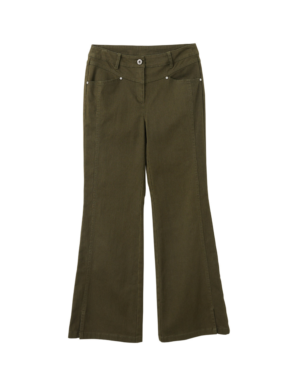 腰下修身切線修飾腹臀線條, 喇叭褲型俐落顯瘦比例更修長。