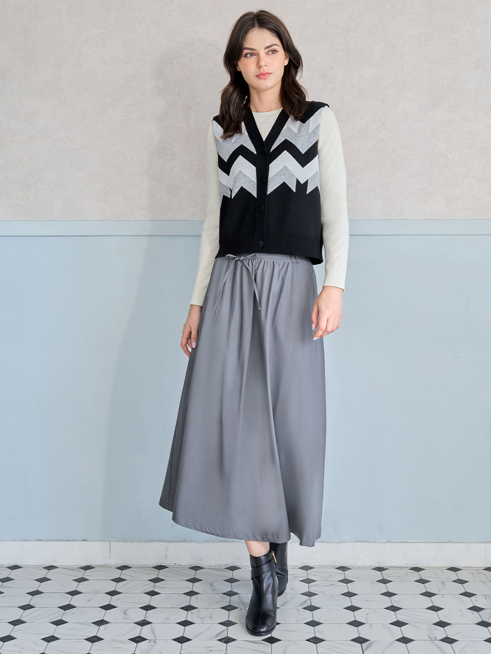 霧光環保皮革, 與長圓裙結合讓女性化穿搭也同時展現了個性風格。 可拆式綁帶能自由玩出不同穿搭。