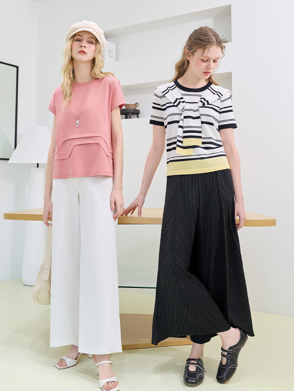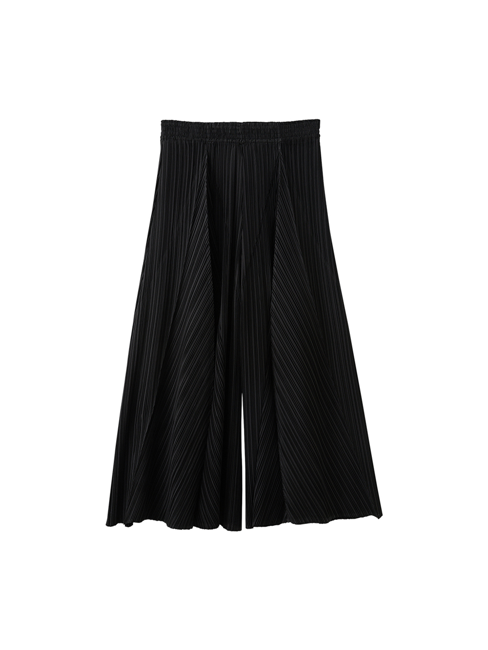 用線條打造不費力的優雅輪廓。 細緻壓褶隨步伐自然展開, 營造輕盈流動感, 寬褲裙版型融合裙裝柔美與褲裝的俐落, 修飾身形也拉長比例。