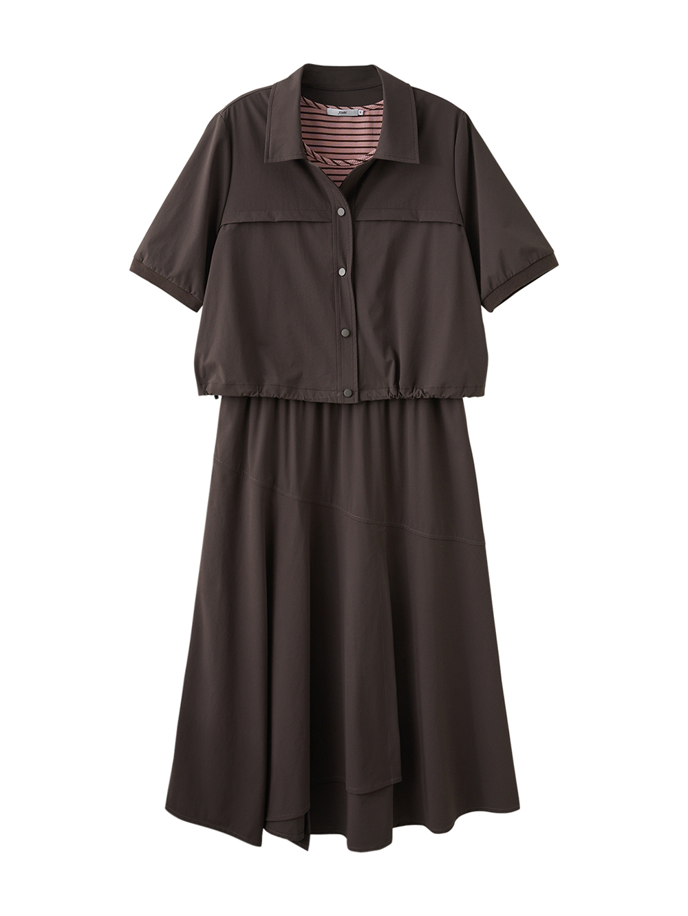 結合短版外套與不規則剪接長裙的兩件式設計, 打造兼具實用性與造型感的都會穿搭。
