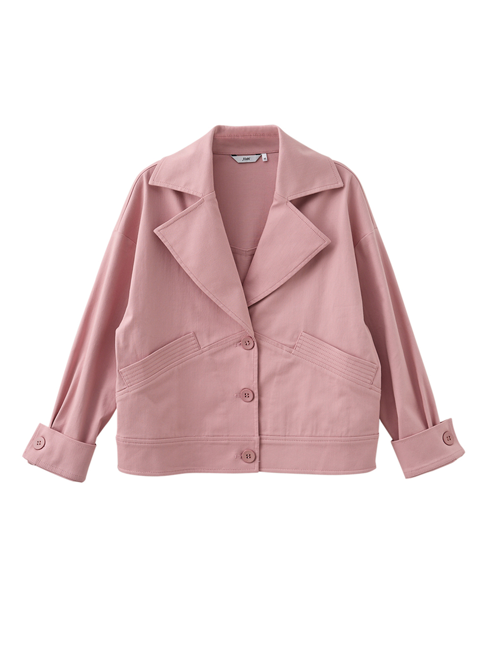 融合了西裝領的俐落與休閒夾克的隨興, 大貼袋立體壓線設計, 讓簡約的素色外套多了層次感與工裝感的帥氣。