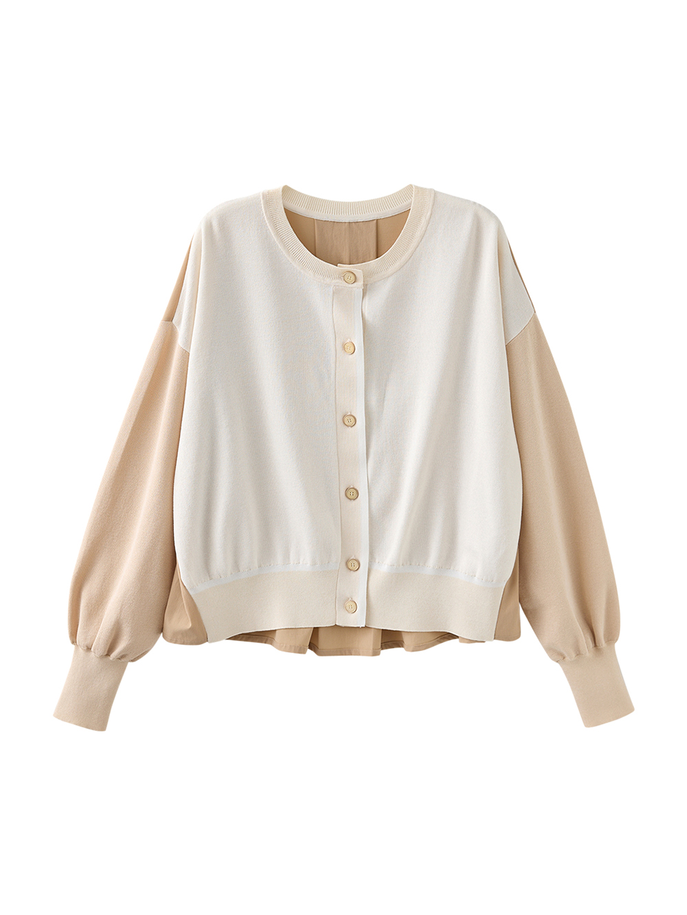 柔軟針織面料, 袖身宇下擺拼接不同色彩的輕盈平織布, 在保有溫柔包覆感同時, 也增添垂墜顯瘦的效果。