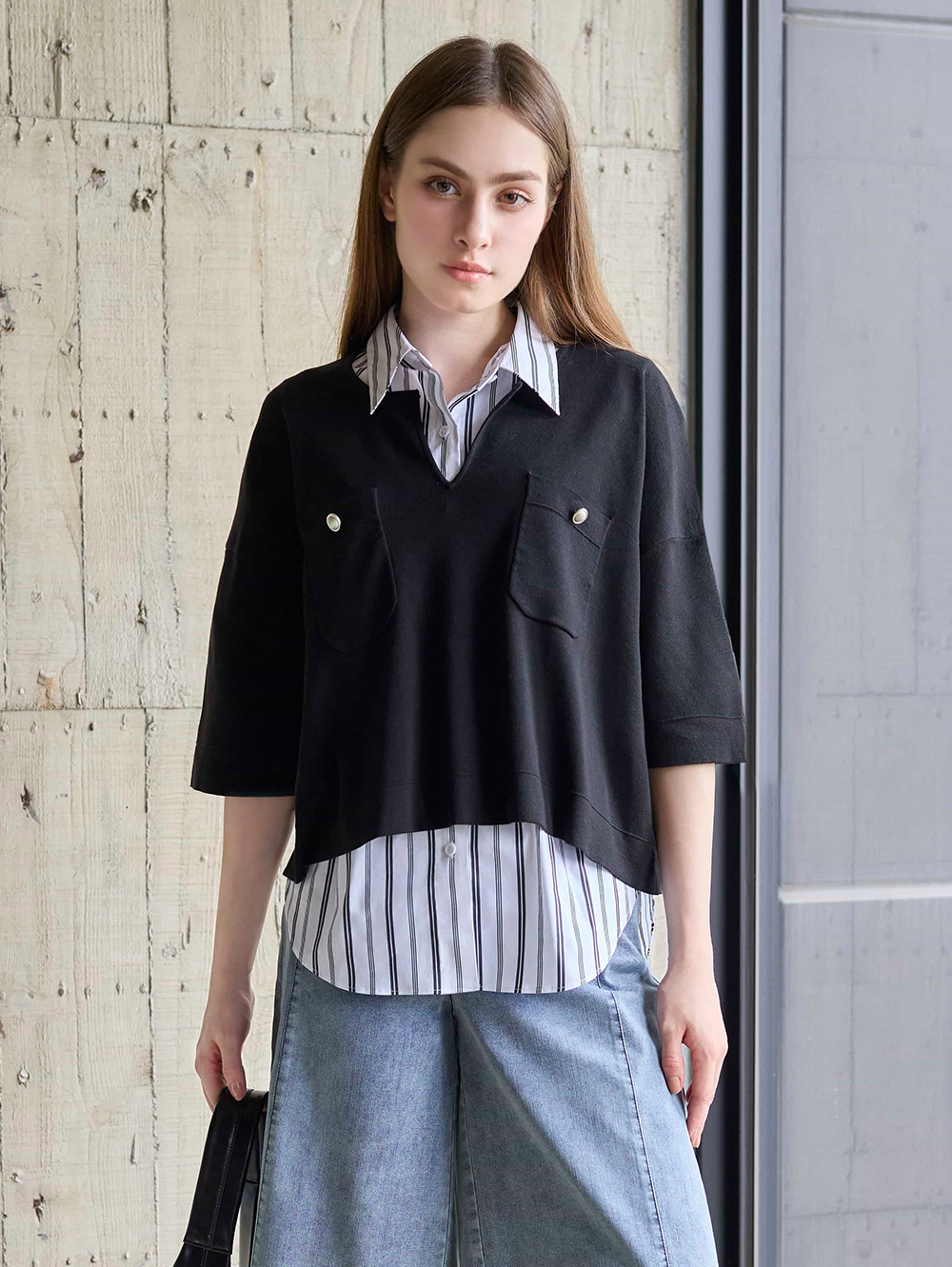 V領寬鬆針織外罩, 搭配背心式襯衫內搭, 活力青春學院風 ; 可組合穿著也能各自另外搭配。