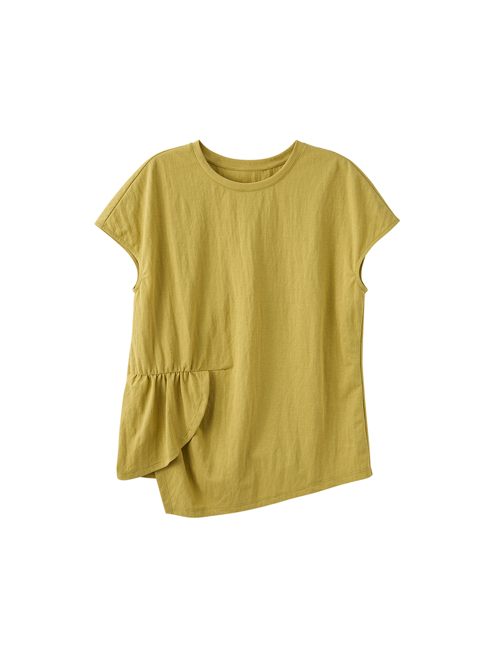 簡單之中多一點設計。 以基礎圓領為基礎, 加入不對襯拼接與弧形層次剪裁, 讓基礎百搭T恤更有視覺重點。