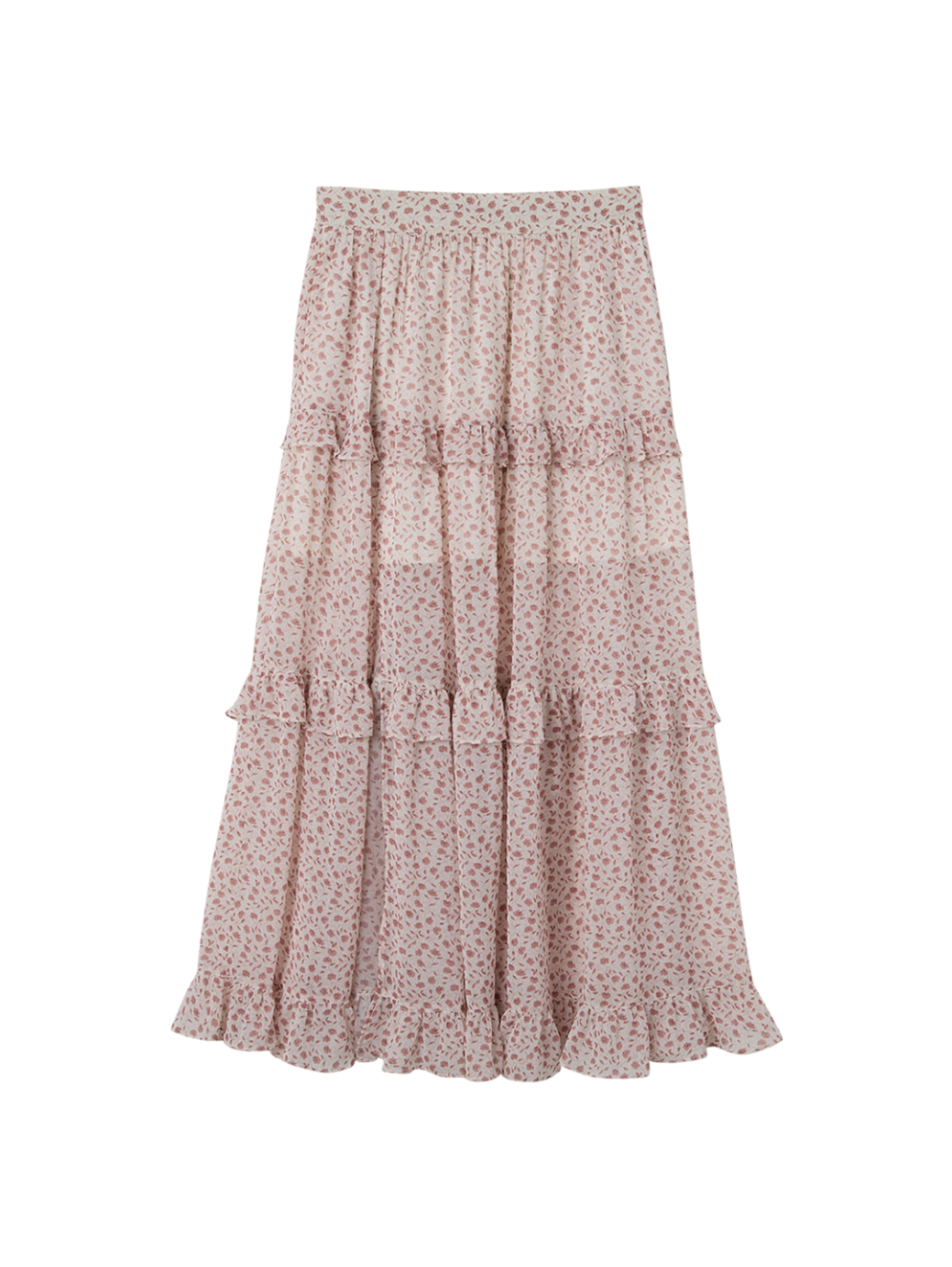 蛋糕裙加上小荷葉細節,還有開衩剪裁,碎花的雪紡布料自帶垂墜性,溫柔浪漫。有內裡,不怕透,可與同系列上衣成套穿搭。