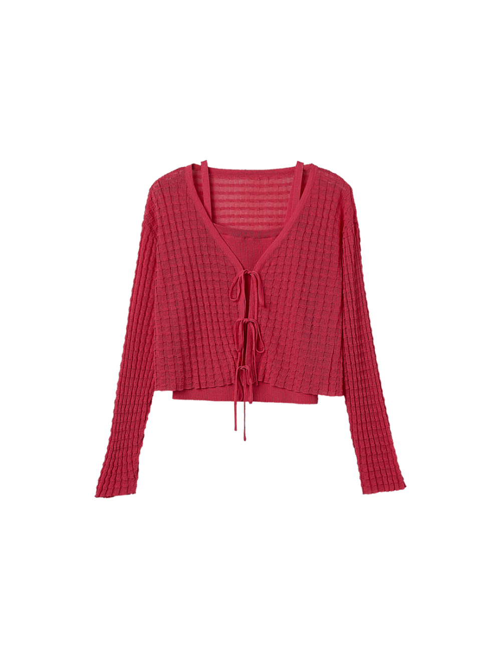 溫柔甜美的兩件式針織組合,罩衫胸前綁帶設計可以自由調節。也可以搭配自己的背心,一衣多穿。