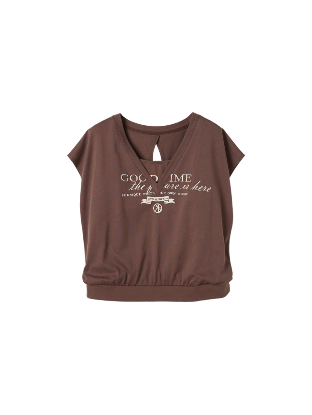 假兩件設計,背心與短袖在內側下擺車固定。正面文字錯位排列、背後小挖空,富有趣味性,穿起來輕鬆感十足。