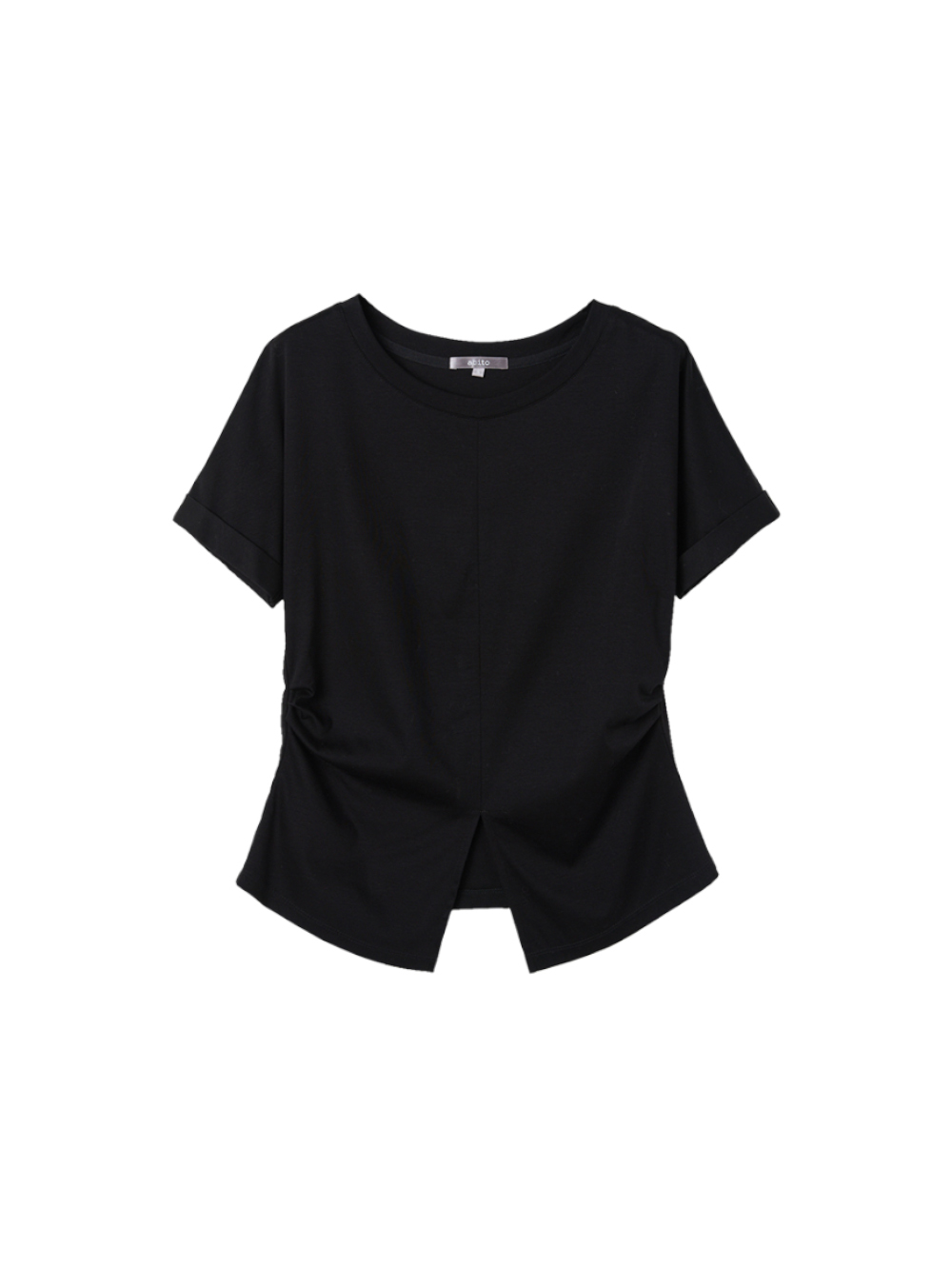 簡約的素面短袖上衣,正面有倒V開衩剪裁,增添了設計感,舒適百搭又耐看,不會退流行。