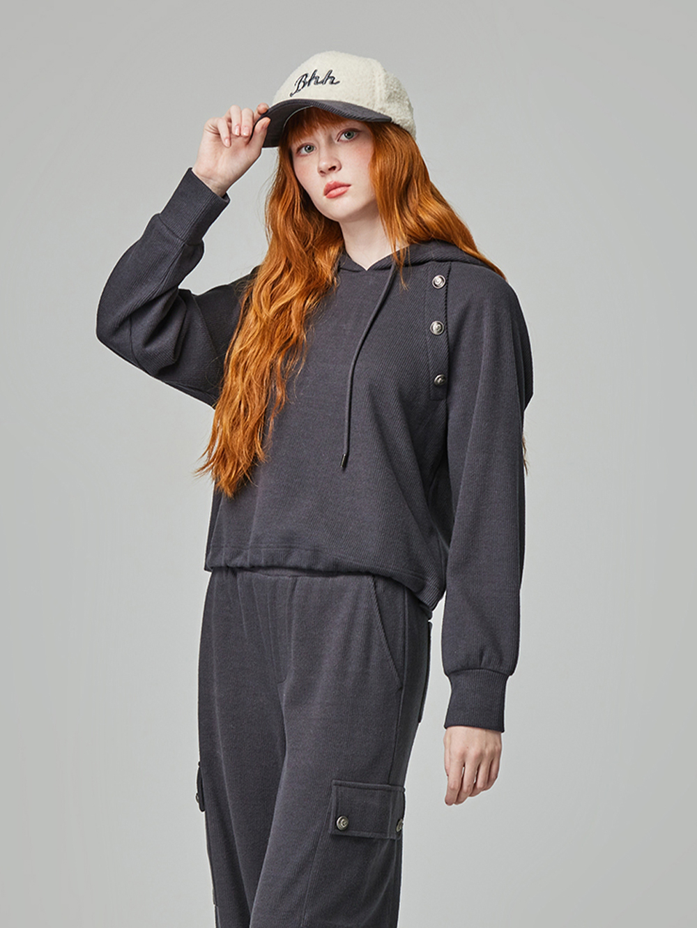 *落間拉克蘭袖版型 *袖肩金屬裝飾釦細節 *下擺可自由調節設計 *布料柔軟親膚