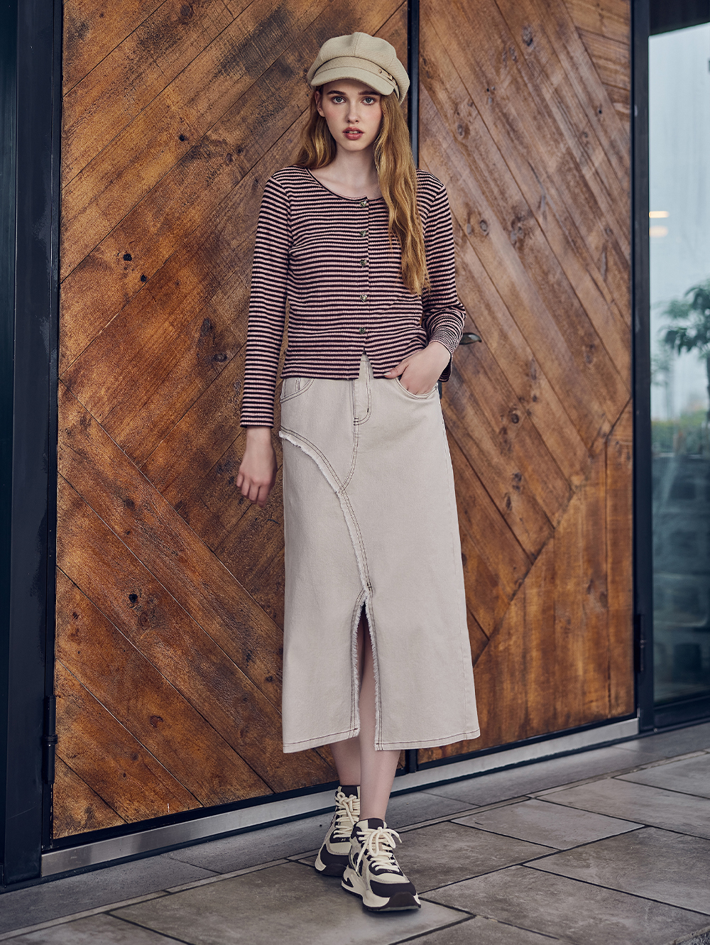 *斜邊開口造型修飾臀型 *舒適棉質面料 *裙擺休閒不收邊設計 *日常百搭款