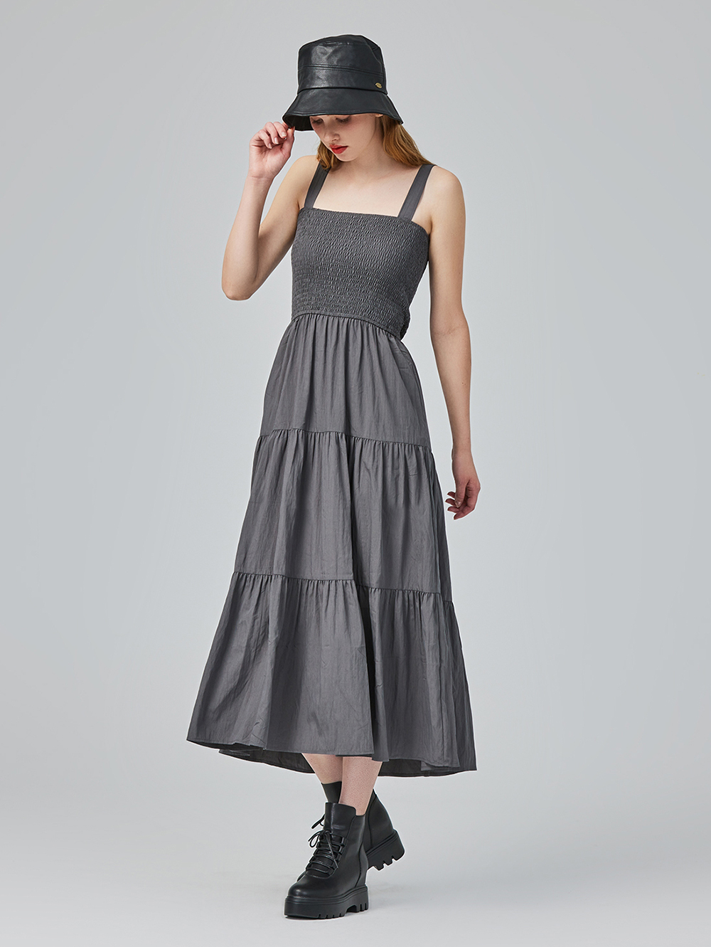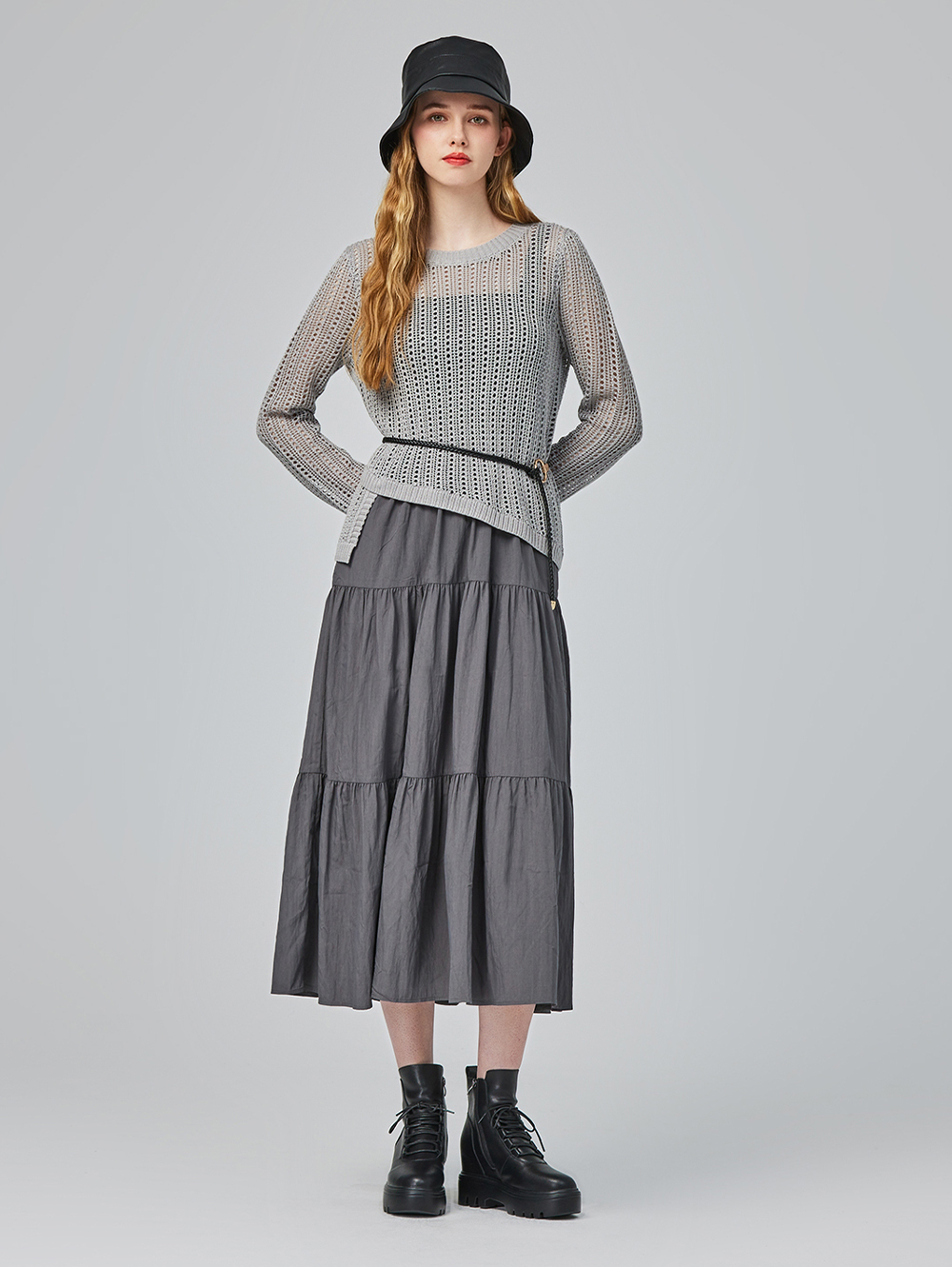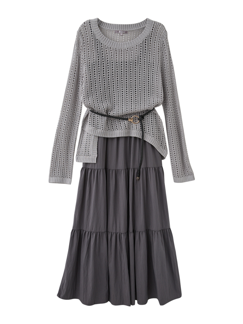 *下擺不對稱開衩造型 *寬鬆簍空針織設計 *內搭連身蛋糕裙 *肩帶釦子可自由調節長度