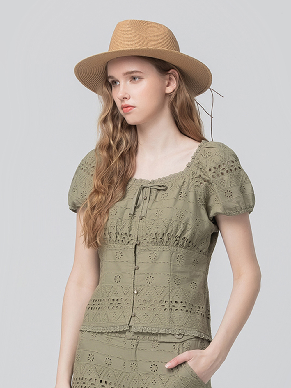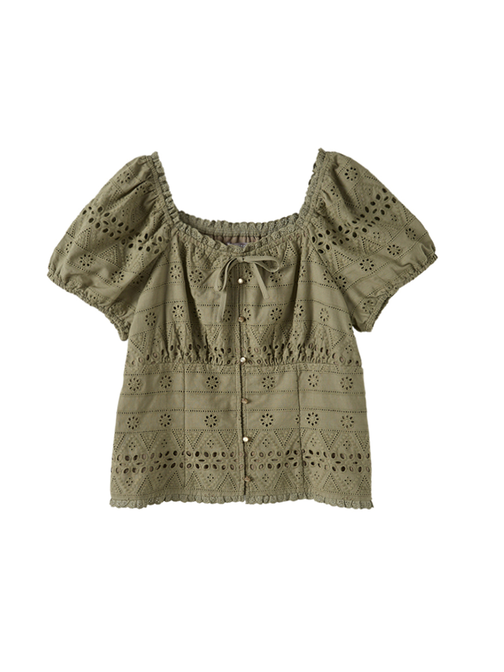 *精緻刺繡蕾絲布料 *可平口、可圓領,兩穿式設計 *領口細緻蝴蝶結綁帶點綴 *短版剪裁,拉長身型比例