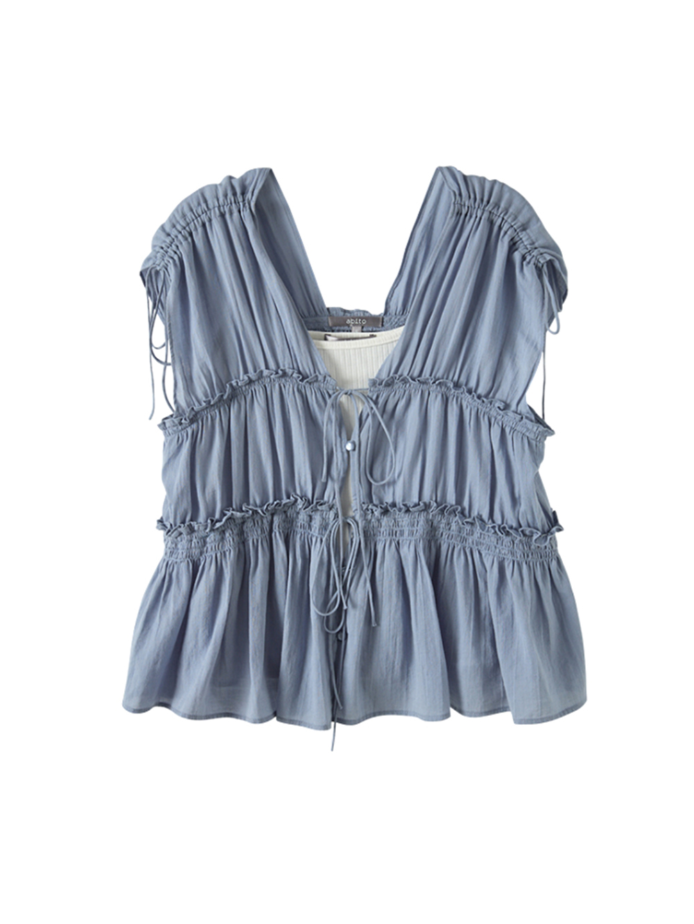 *多層次荷葉邊裝飾特色 *肩線抽繩可自由調整 *布料手感柔軟,垂墜感佳 *內附小背心,兩件式