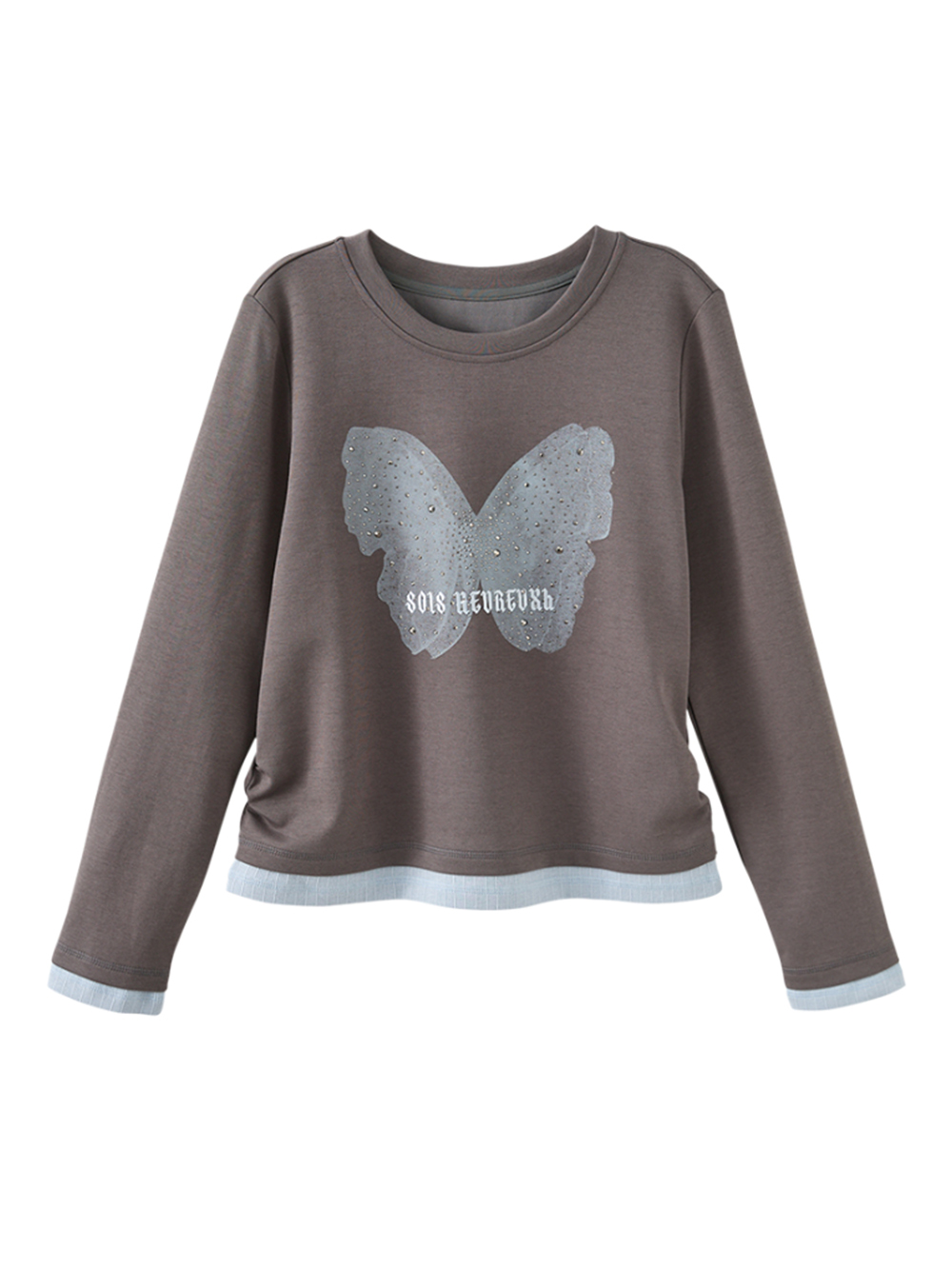 *舒適圓領版型 *下襬、袖口雙層設計 *精細蝴蝶貼鑽造型 *柔軟親膚面料