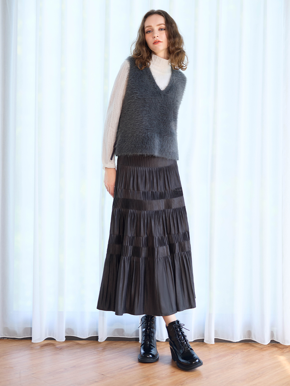 細緻的仿麂皮材質, 呈現出霧面柔光質感, 結合壓褶拼接設計, 層層堆疊出輕盈的律動與立體層次。