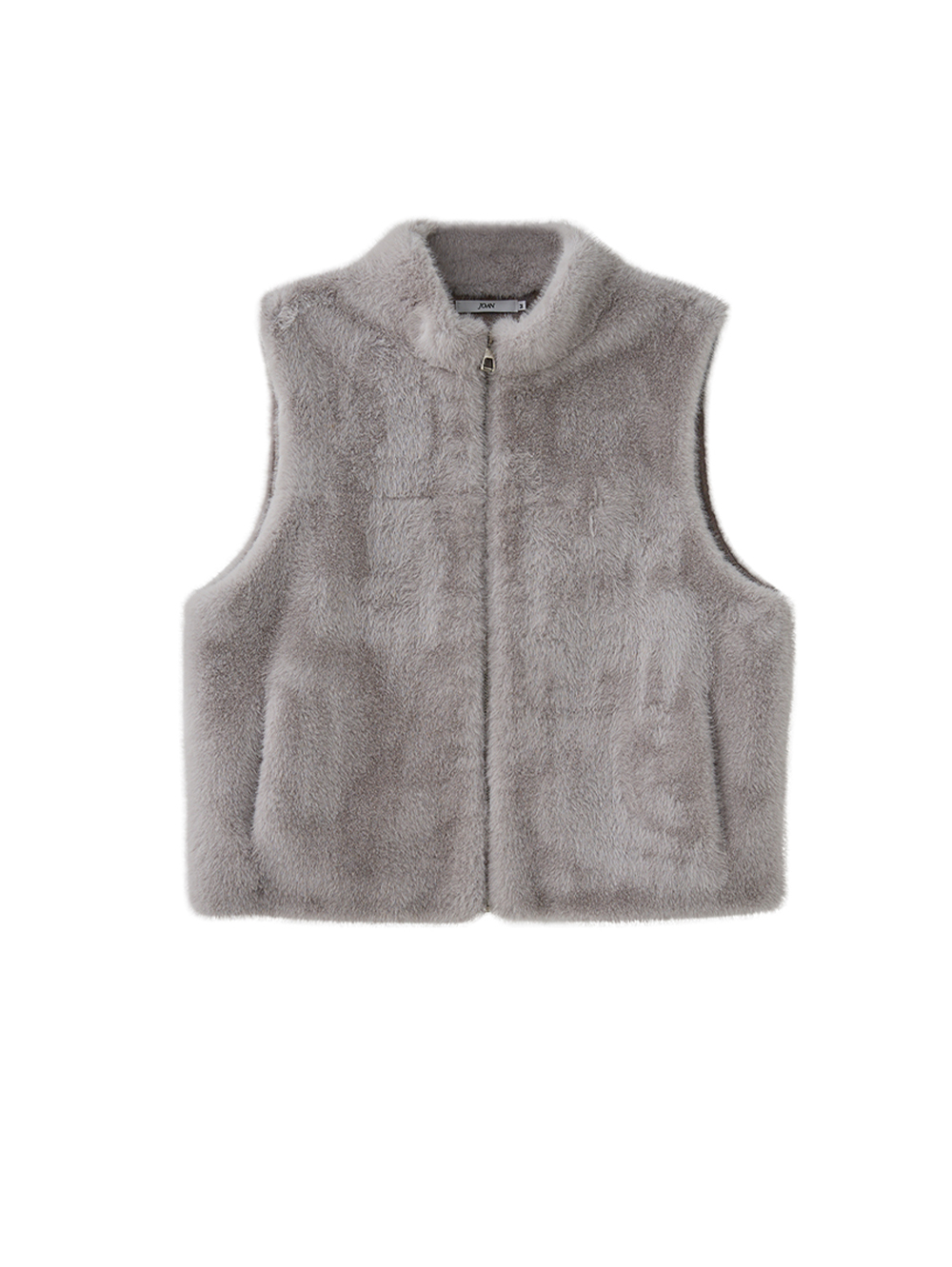 柔軟親膚的仿皮草面料, 手感輕盈卻保有溫暖包覆力; 霧灰色調展現秋冬專屬的柔光氛圍。