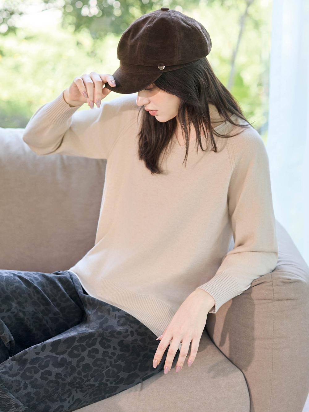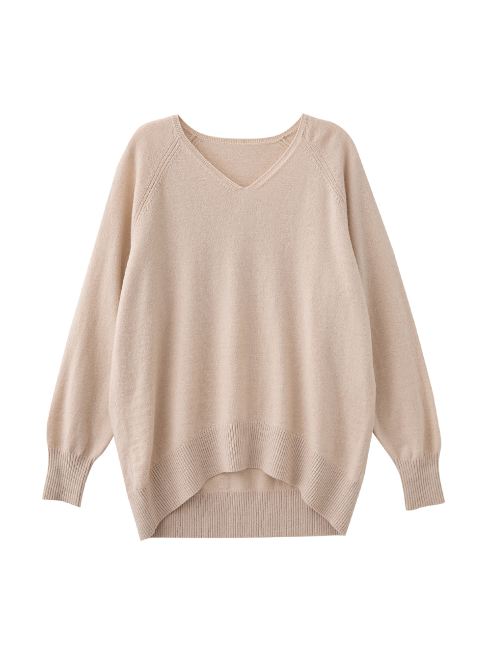 以Csahmere羊絨混紡打造親膚溫暖的質感觸感, V領修飾臉型與頸部線條, 前短後長的版型巧妙拉長腿部比例, 輕鬆穿出隨興的質感日常。