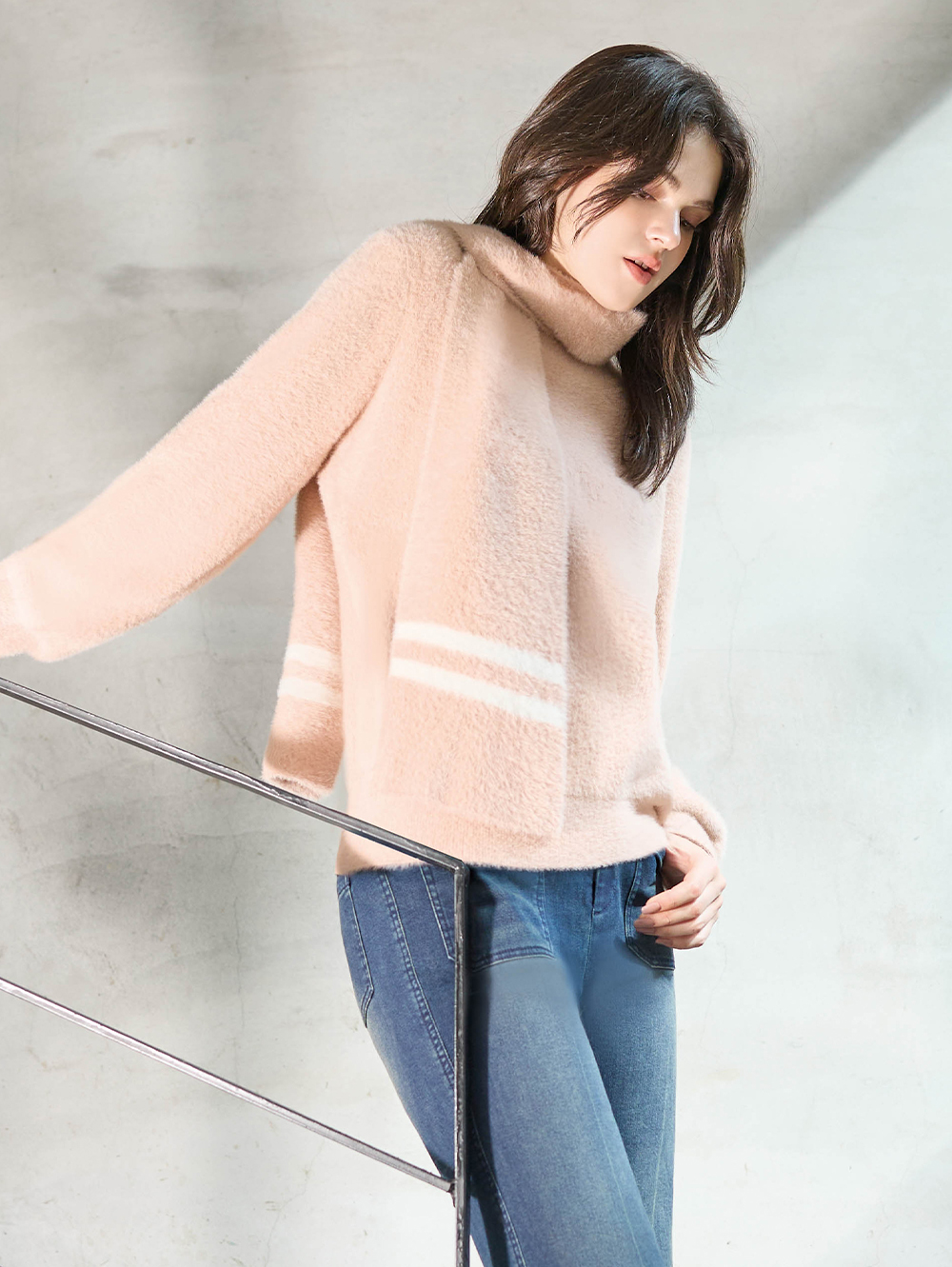 觸感舒適柔軟羽毛紗織程,穿上立即感受溫暖包覆;附上同色圍巾,延續毛絨質感, 輕鬆搭出冬日層次造型。