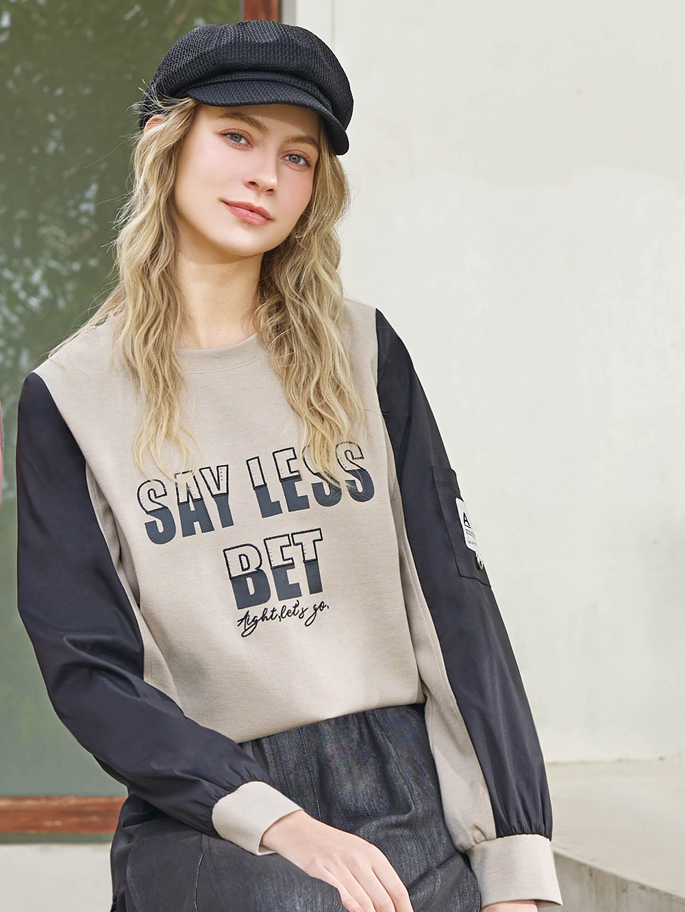 字母印花設計, 搭配異材質拼接剪裁, 提升整體層次感, 下擺抽繩可自由調節衣長, 讓下身搭配更多元。