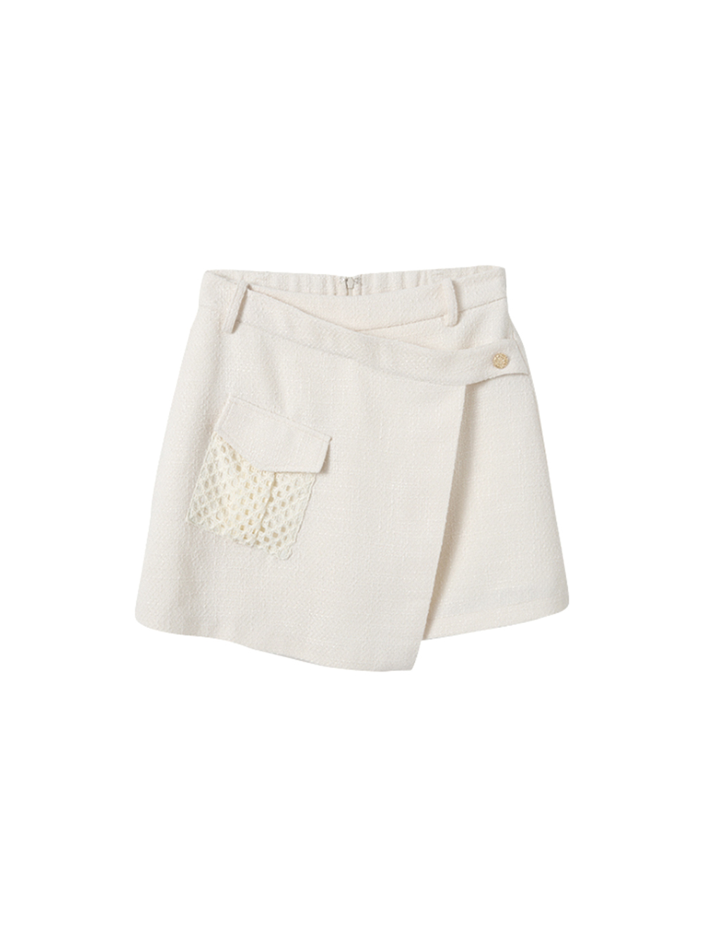 材質屬於較薄軟的小香風毛呢布料,色系清爽柔和,正面不對稱的剪裁帶有休閒感,能中和布料本身的正式感,內建安全褲。可與同系列背心成套穿著。