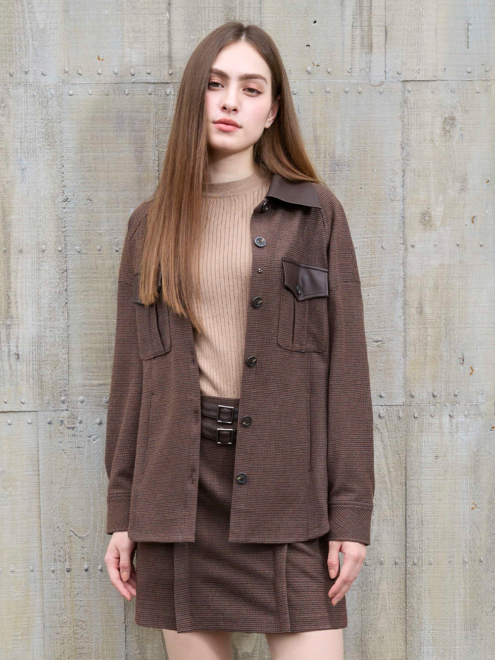 結合溫暖又有挺度的質感細格紋面料, 與雙層水洗皮革腰封細節, 塑造高腰修身比例。