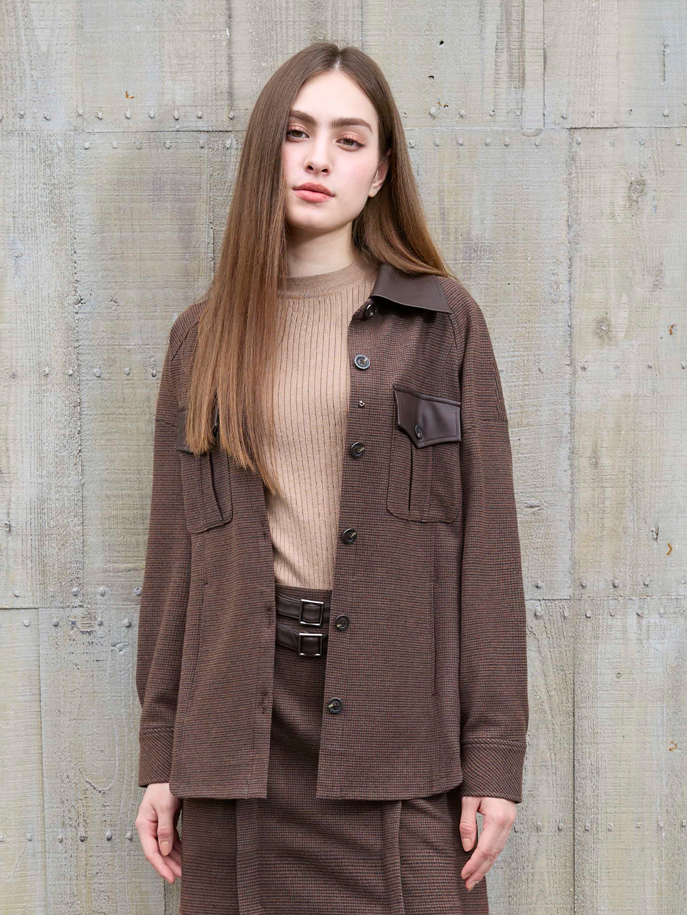 結合溫暖面感格紋布料與仿皮革異材質拼接, 位經典襯衫外套注入率性格調。厚薄適中, 可當襯衫亦可作為外套穿搭。